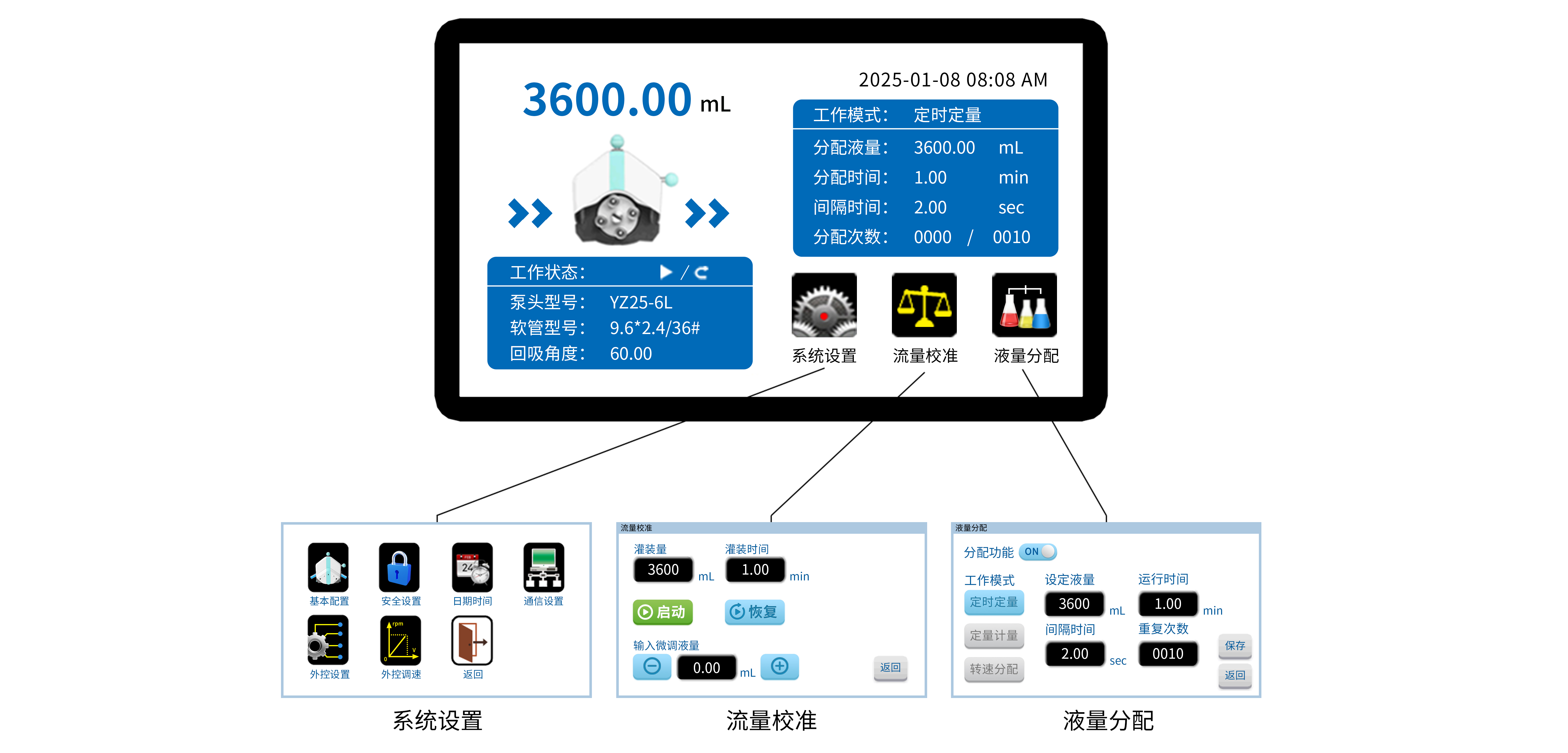 定时定量分配:设置分配液量,分配时间,分配次数,间隔时间;